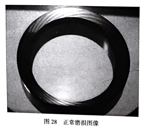 機械費米鞥,密封面全面接觸磨損圖像見圖28,其中軟環(huán)的環(huán)帶比硬環(huán)窄,硬環(huán)密封面上的磨損寬度與軟(窄)環(huán)寬度相等,一個環(huán)上有輕微磨損或無明顯磨損。有時磨損的表面非常光滑,干涉儀檢查只有輕微的變形。