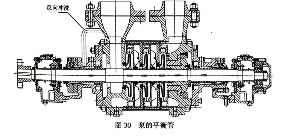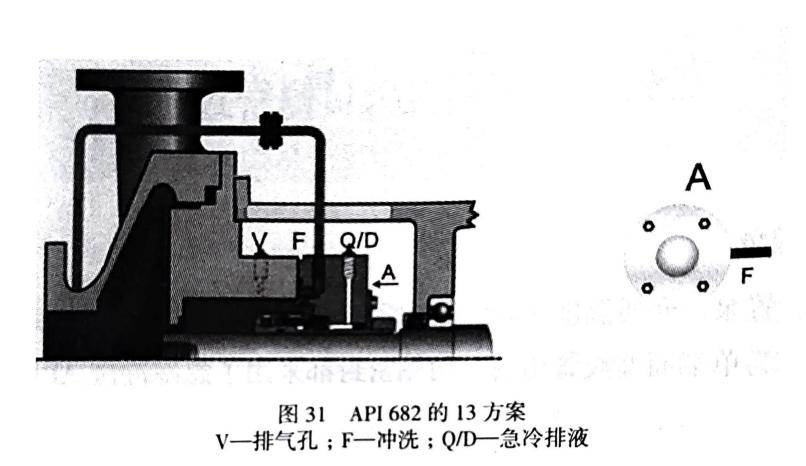 密封損壞的原因是水質(zhì)結(jié)垢,波紋管的波峰和波谷被水垢填死,密封失去彈性,多次更換密封的結(jié)構(gòu)形式還是出現(xiàn)類(lèi)似的問(wèn)題。經(jīng)過(guò)查看泵的結(jié)構(gòu)圖,大家一直認(rèn)為的泵的平衡管的管線實(shí)際是一個(gè)反向旁通自沖洗(圖 30)。也就是 API682的 13 方案,如圖 31。這樣一來(lái),該泵人口側(cè)密封就有了兩種沖洗方案,即 API682的 13 方案 +62 方案。