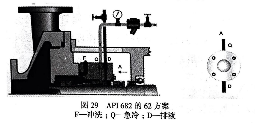 某裝置泵,介質(zhì)溫度 380℃,介質(zhì)為渣油,電動(dòng)機(jī)轉(zhuǎn)速為2950r/min密封形式為單端面波紋管密封,兩側(cè)密封都采用了急冷沖洗 API682《機(jī)械密封》62方案,見(jiàn)圖29。沖洗介質(zhì)為清水(常溫)。