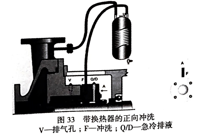 在介質(zhì)高于 150℃時(shí),就應(yīng)加冷卻沖洗。選用API682的21方案(圖33),即帶換熱器的正向沖洗,選用換熱面積為0.3~0.9m’的換熱器冷卻后的密封工作溫度控制在 80℃左右。